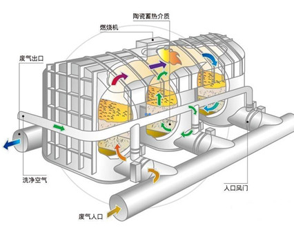 RTO主體結構由燃燒室、陶瓷填料床和切換閥等組成。該裝置中的蓄熱式陶瓷填充床換熱器可使熱能得到回收,熱回收率大于95%,處理VOC時不用或使用很少的燃料。